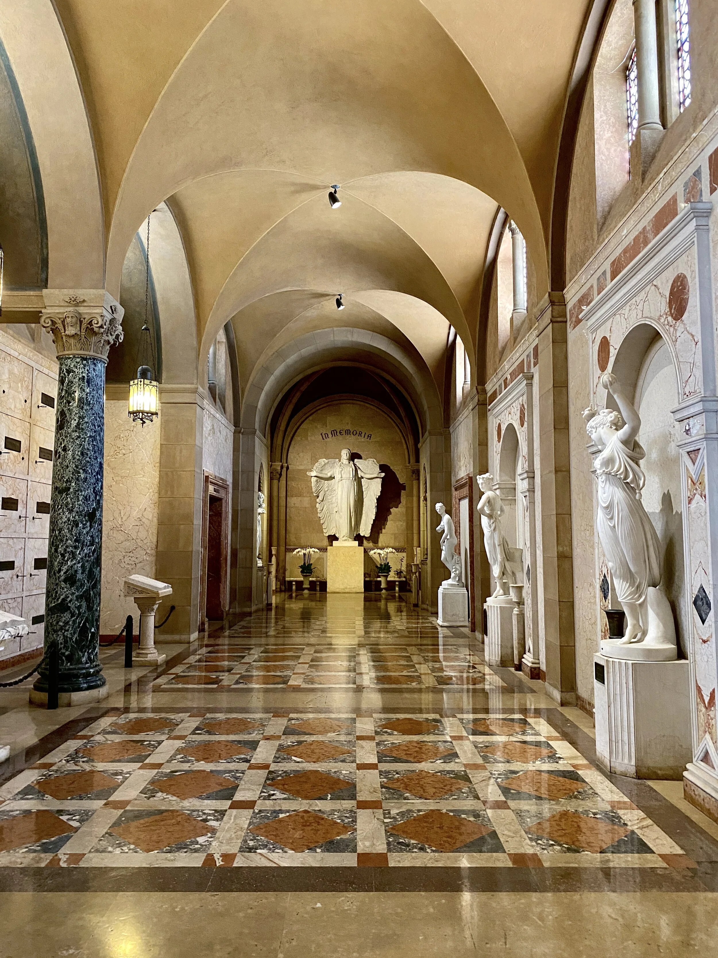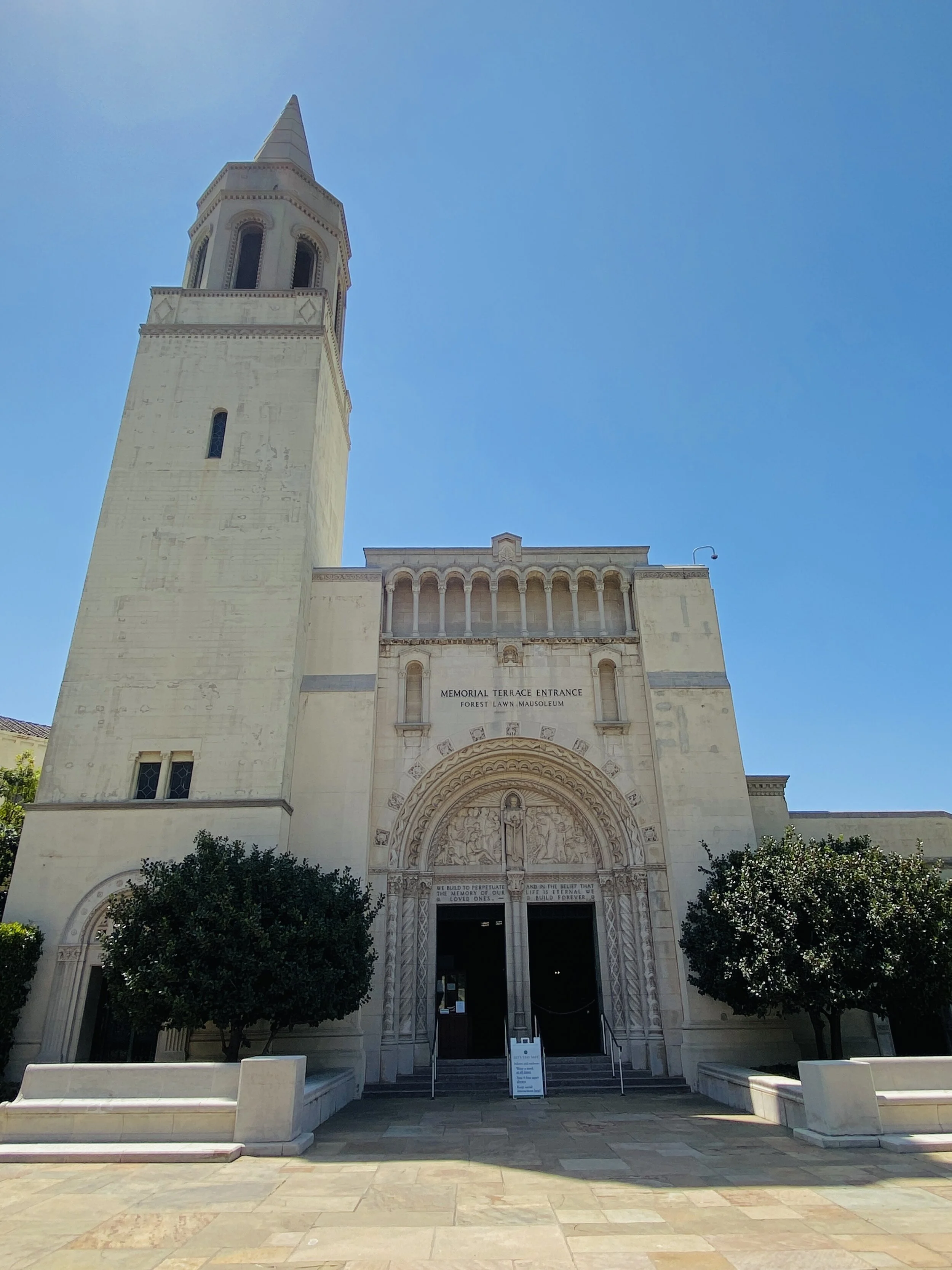 With numerous locations throughout Southern California, Forest Lawn Memorial Park in Glendale is the original and flagship location of the six cemeteries currently in operation. It’s hard to miss, since its iconic white cross can be seen for miles from the 5, 134 and 2 freeways upon its perched positioned. Founded in 1906 by Dr. Hubert Eaton, the Glendale location sprawls across 300 acres of rolling hills. As mentioned earlier, you’d be hard pressed to view any cemetery as an “attraction”, but Eaton was determined to transform the depressing imagery that is often associated with most cemeteries into a bright and vibrant celebration of life at Forest Lawn. Eaton made sure the grounds were always lush and manicured, planted trees to emulate a park setting, erected classic artwork and sculptures to inspire culture, and constructed numerous pieces of architecture to evoke the majesty of old Europe. This was all in the hopes that it would create a welcoming gathering space for the community. Once you get passed the idea that you’re on the grounds of a cemetery, I think Eaton was pretty successful achieving that vision.