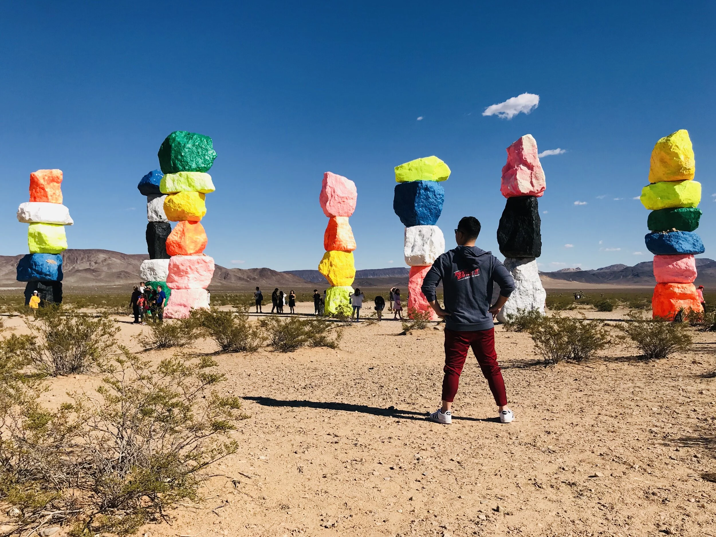 The desert between California and Nevada is full of wonderful oddities. From the haunting beauty of the rocky vistas that loom in every direction, to the world’s tallest thermometer, or the largest solar power plant in the world (yes, that’s what those giant mirrors are outside of Primm), and all the Alien Fresh Jerky and Mad Greek Cafe pit-stops along the way, the desert never ceases to amaze. But as varied as this repertoire may be, one of the few things that the desert has never been known for is being awash in color… or at least until Ugo Rondinone’s Seven Magic Mountains entered the scene.