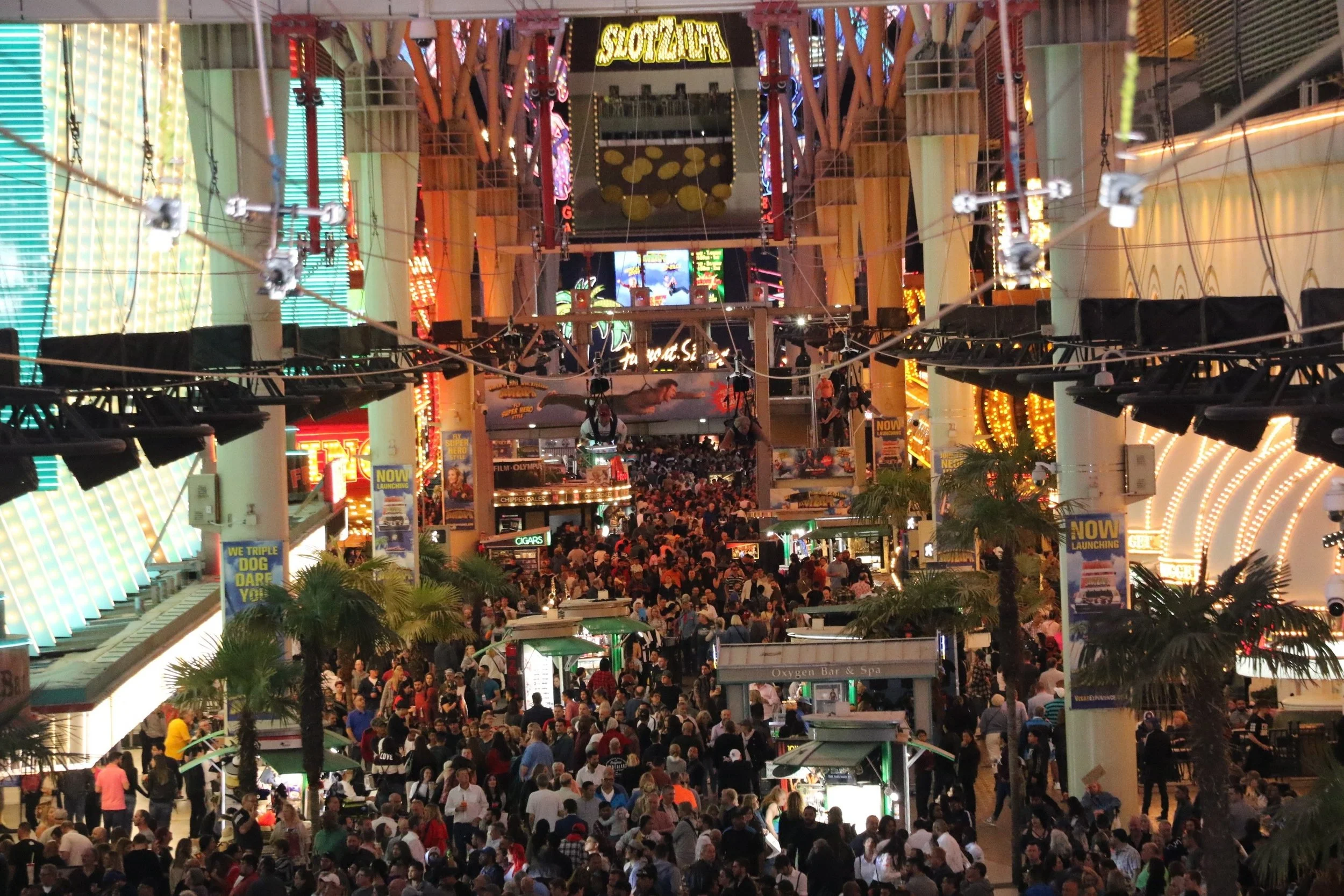 The SlotZilla tower & ticket booth is located on the east end of the Fremont Street Experience (look for the giant slot machine). The regular zipline option lands between Fremont and Four Queens. The “Zoomline” option lands at Golden Gate.